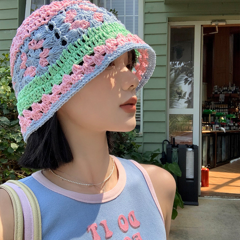 小清新な手作りのニット漁師帽女性の夏の透かし彫りの通気性が甘いです。