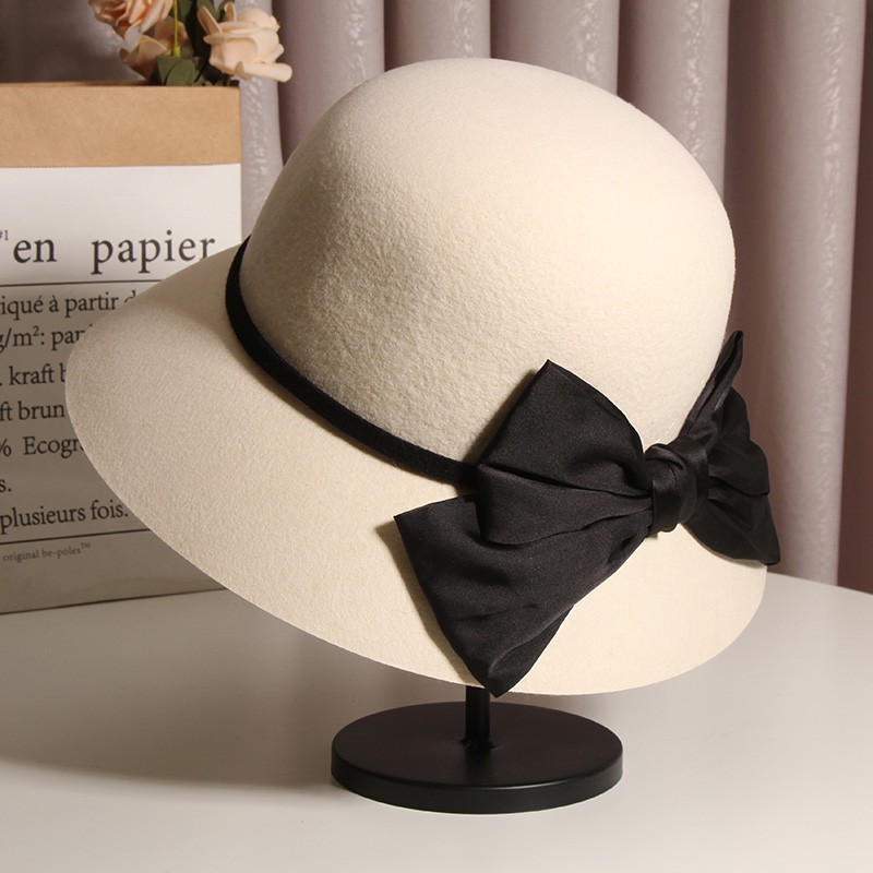 フランスのウールは小さい軒の漁師の帽子の女性の秋冬のヘボンの風の優雅な復古の帽子のドームの蝶結びの盆の帽子です。