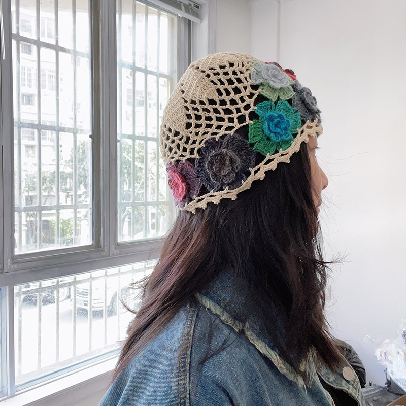 文芸範手作り花包頭帽女性名族風休暇旅行夏通気透かし彫りベレー帽