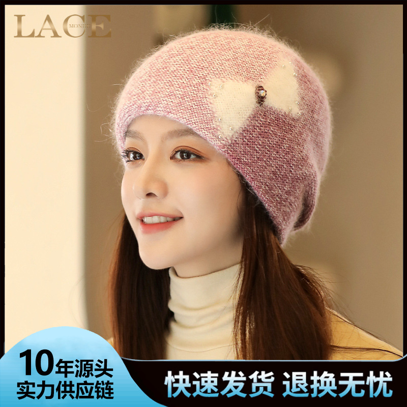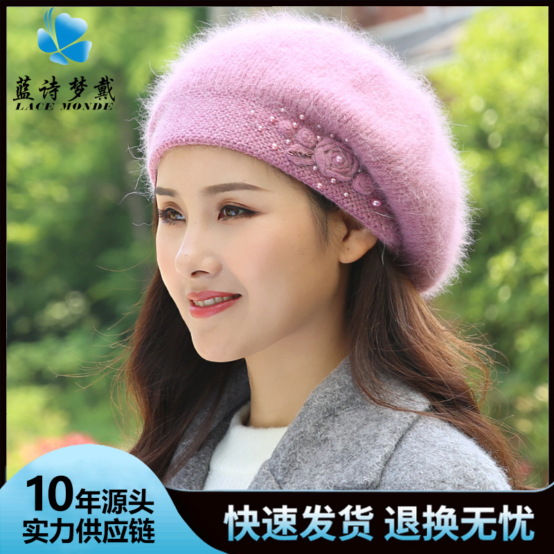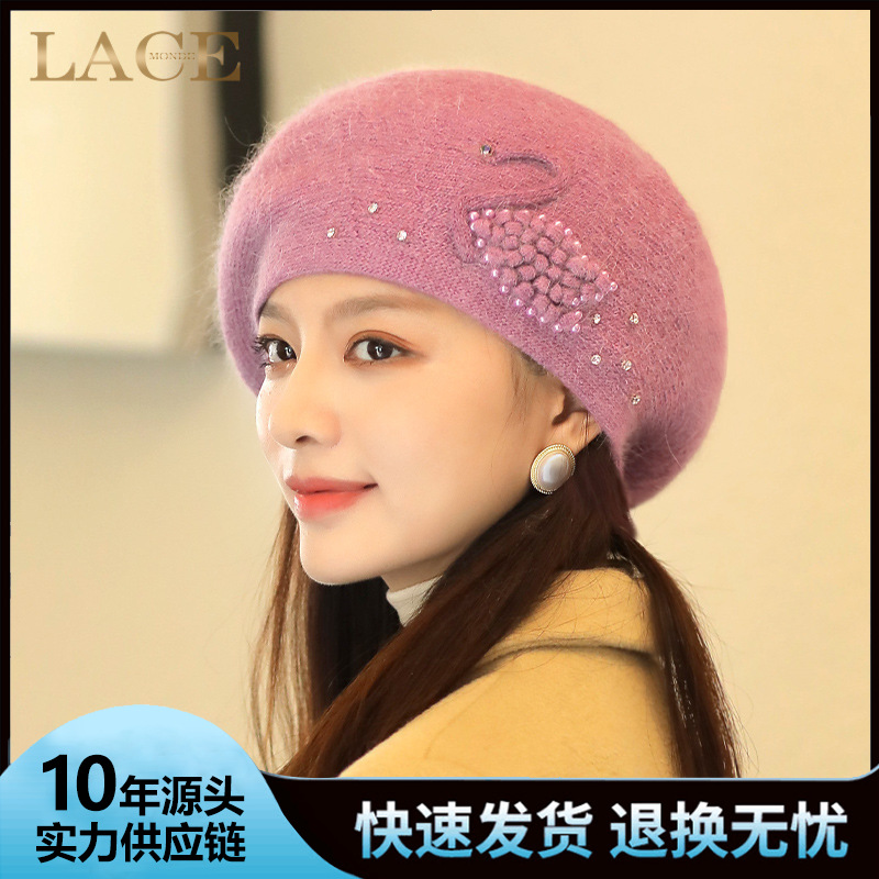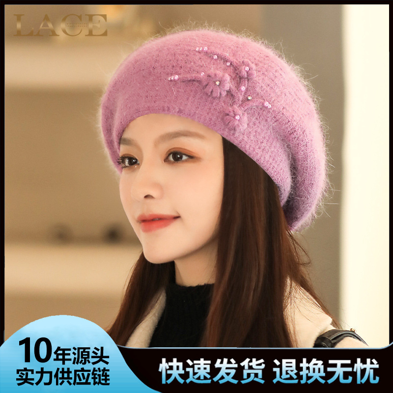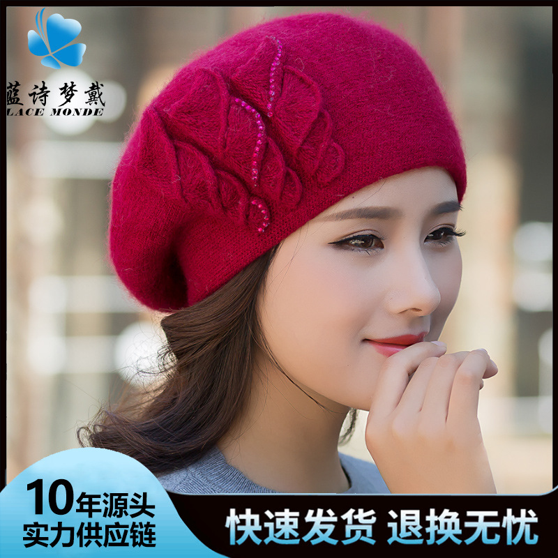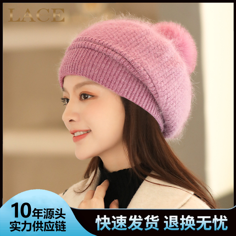 ベレー帽女性秋冬二重厚手保温新型ウサギ毛ニット毛糸帽日系ネット赤耳保護キャップ
