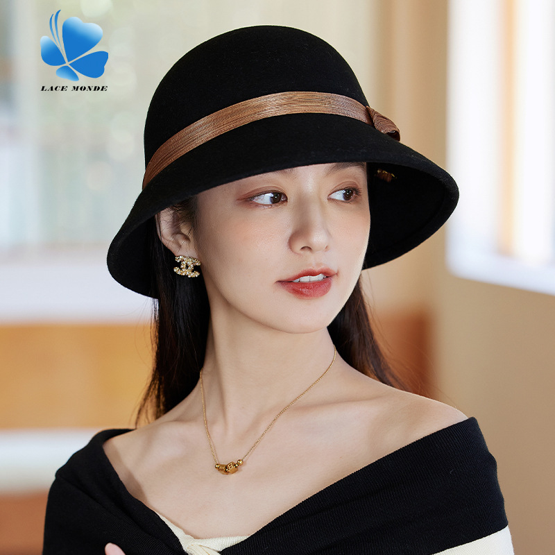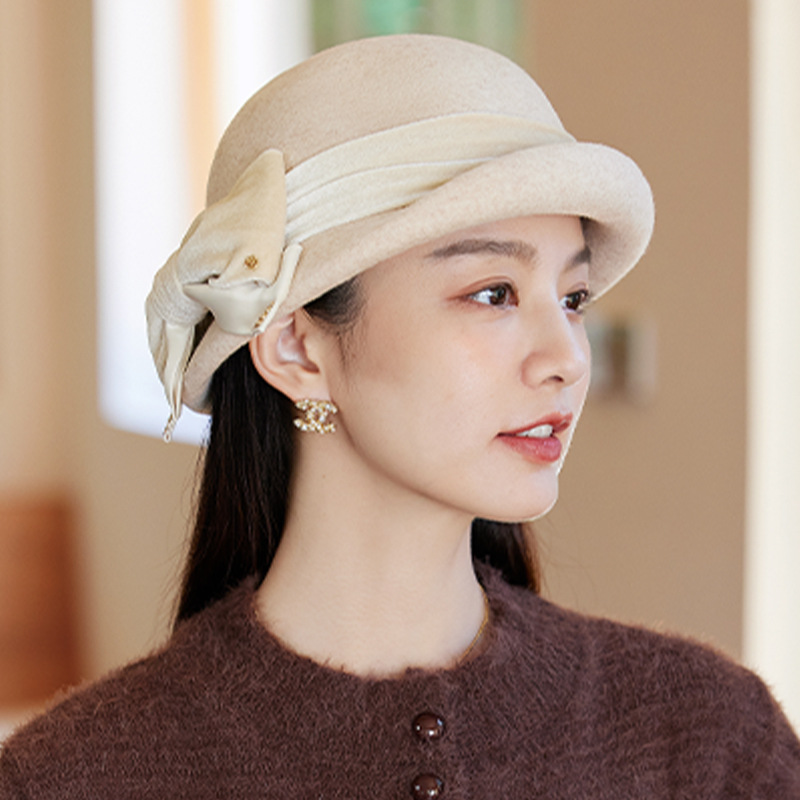 工場直販フランス製高級シルクとリネンのサテンリボン付きパールフィッシャーマンハット、女性用秋冬新作オーストラリア産ウールフェルトハット卸売