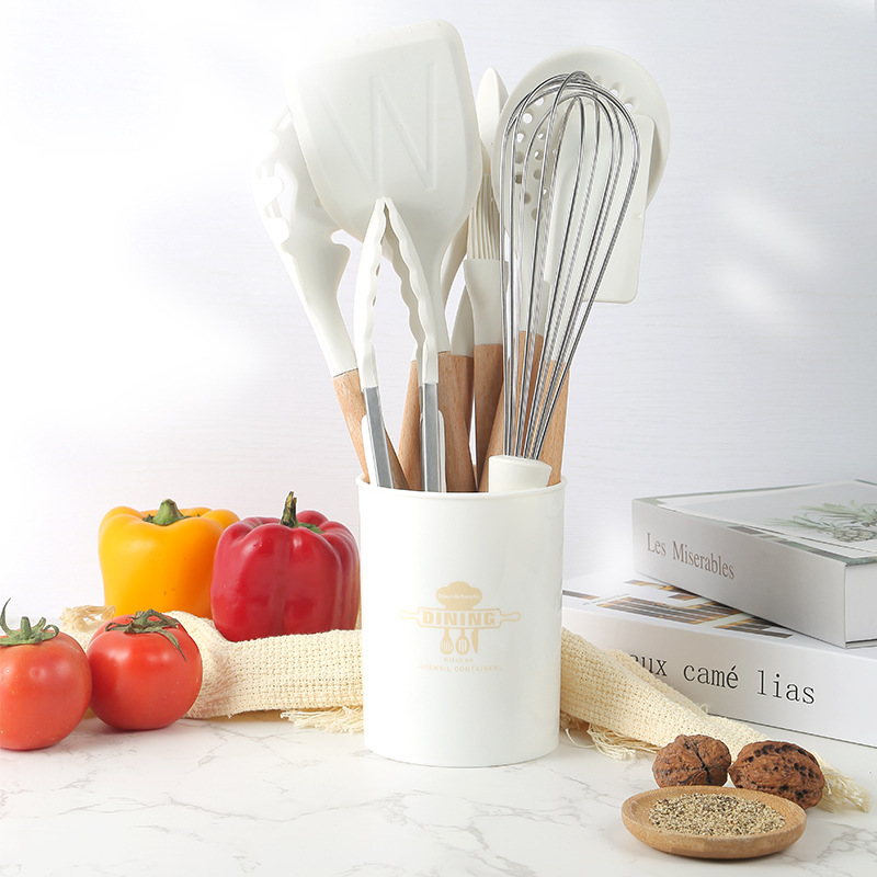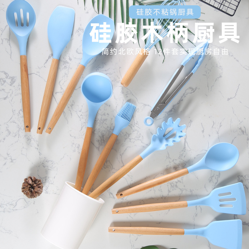 木の柄のシリカゲルの調理器具セット12点セットの収納桶がくっつかないシャベルスプーンの調理器具11点セットのシリカゲルシャベルスプーン