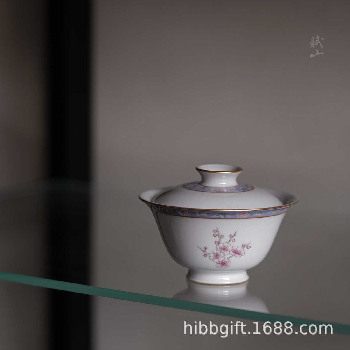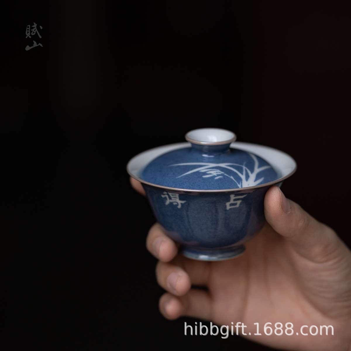 山堂蓋碗雲山藍梅竹紋花蓋碗茶杯手描き茶碗茶具礼箱代件