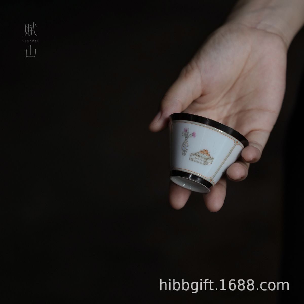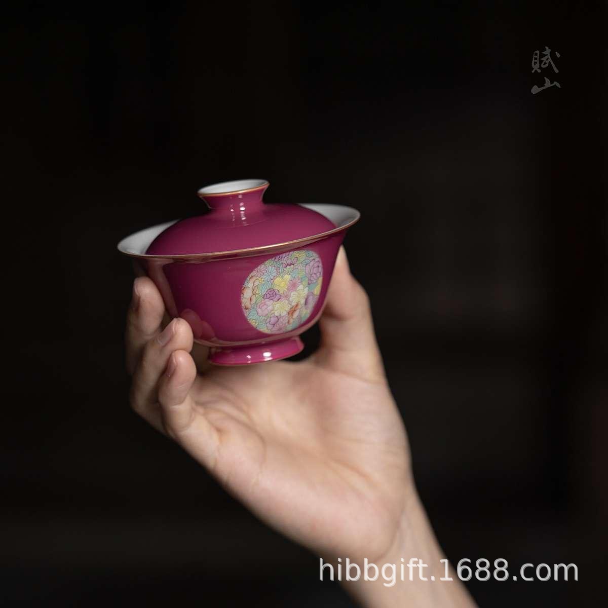 賦山堂蓋碗青衣紫古彩清供蓋碗茶杯手描き茶碗茶具礼箱代件