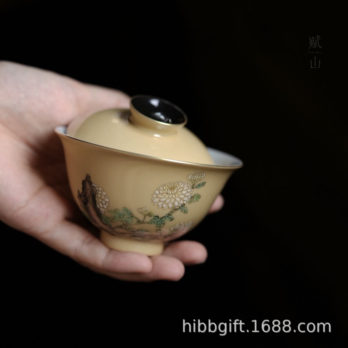 山堂蓋碗ウグイス黄秋宥菊蟹蓋碗茶杯手描き茶碗茶具プレゼント