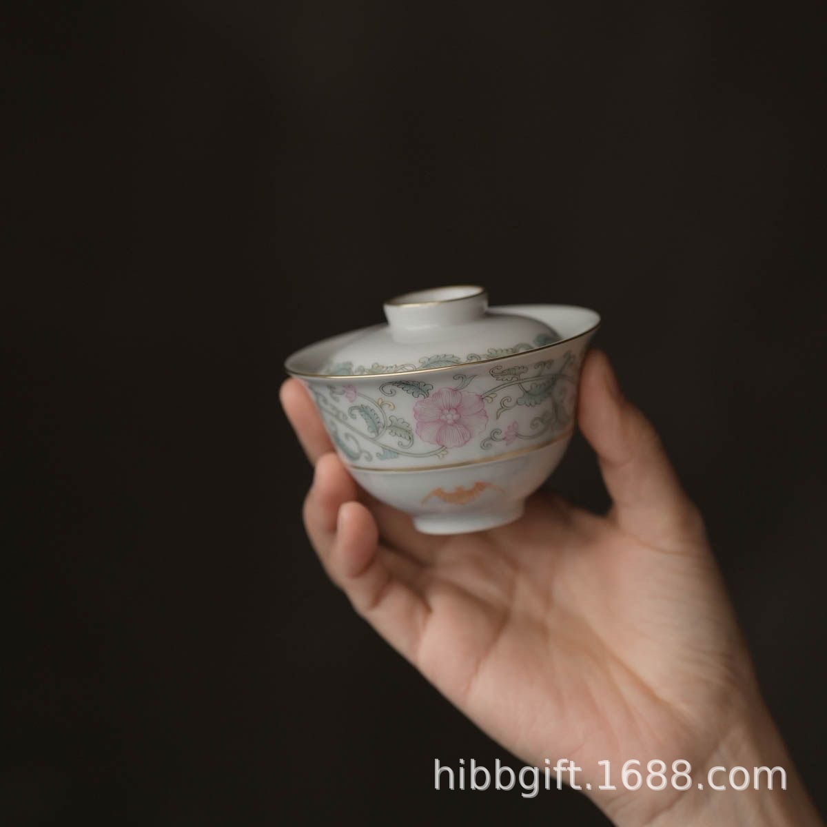 山堂蓋碗に枝蓮のコウモリの紋様をつけて碗のお茶の杯をかぶせます。