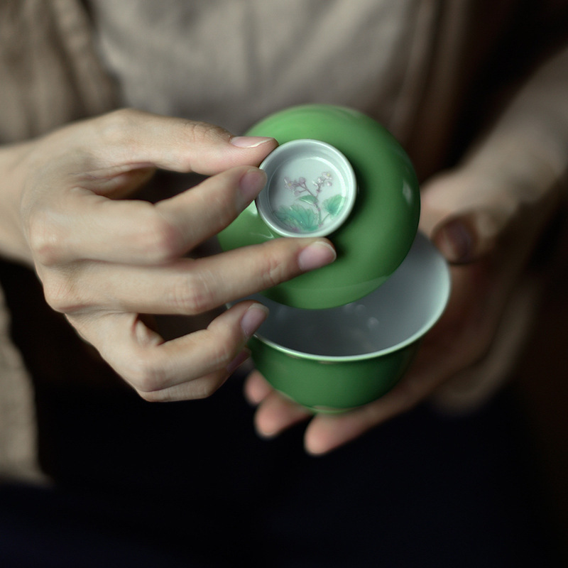 山堂緑釉薬粉彩荷緑海棠文仕蓋碗茶碗の小さいサイズのお茶碗を入れます。