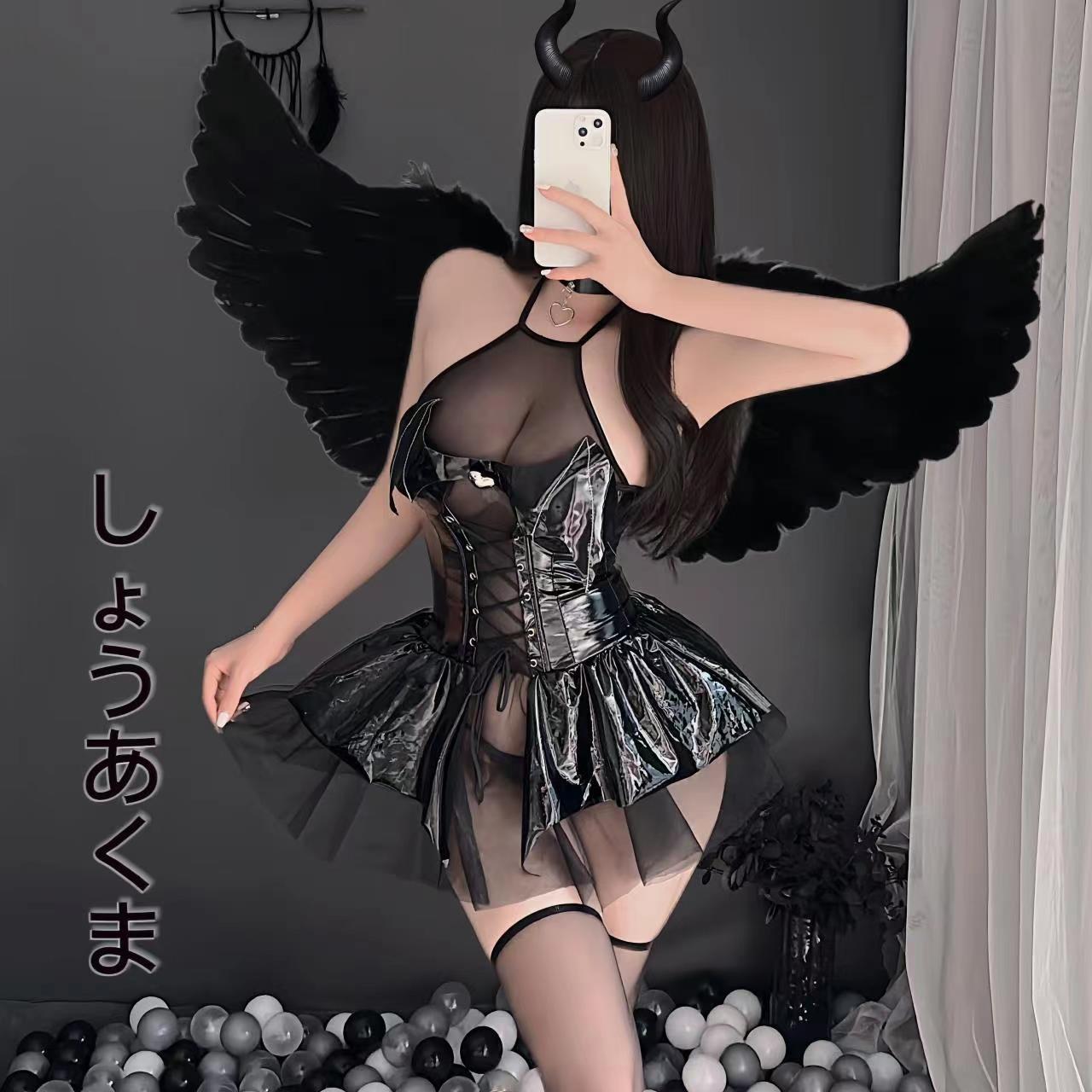 セクシーな下着の明るい面のPUは首を掛けてコウモリの小さい悪魔の透視のスカートのセクシーなスーツの卸売りを掛けます。