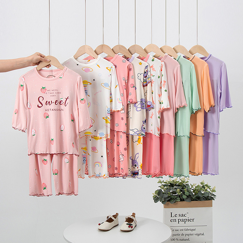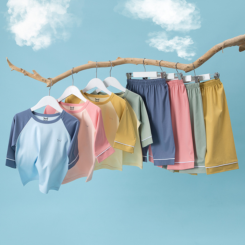 夏の子供の家の服のセットのレカコットンパジャマの男の子の半袖の7分のズボンの純綿の女の子のゆったりとしたエアコンの服