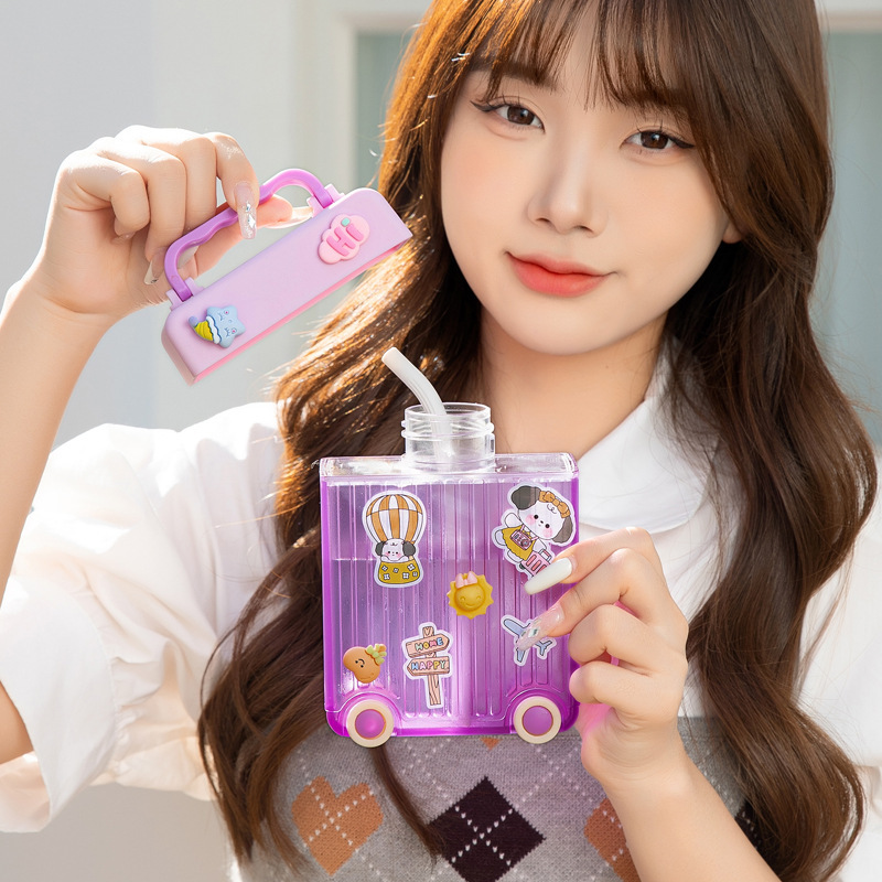 漫画プラスチックカップクリエイティブスーツケース水カップかわいい男女学生シリコーンストローポータブル屋外プラスチックケトル