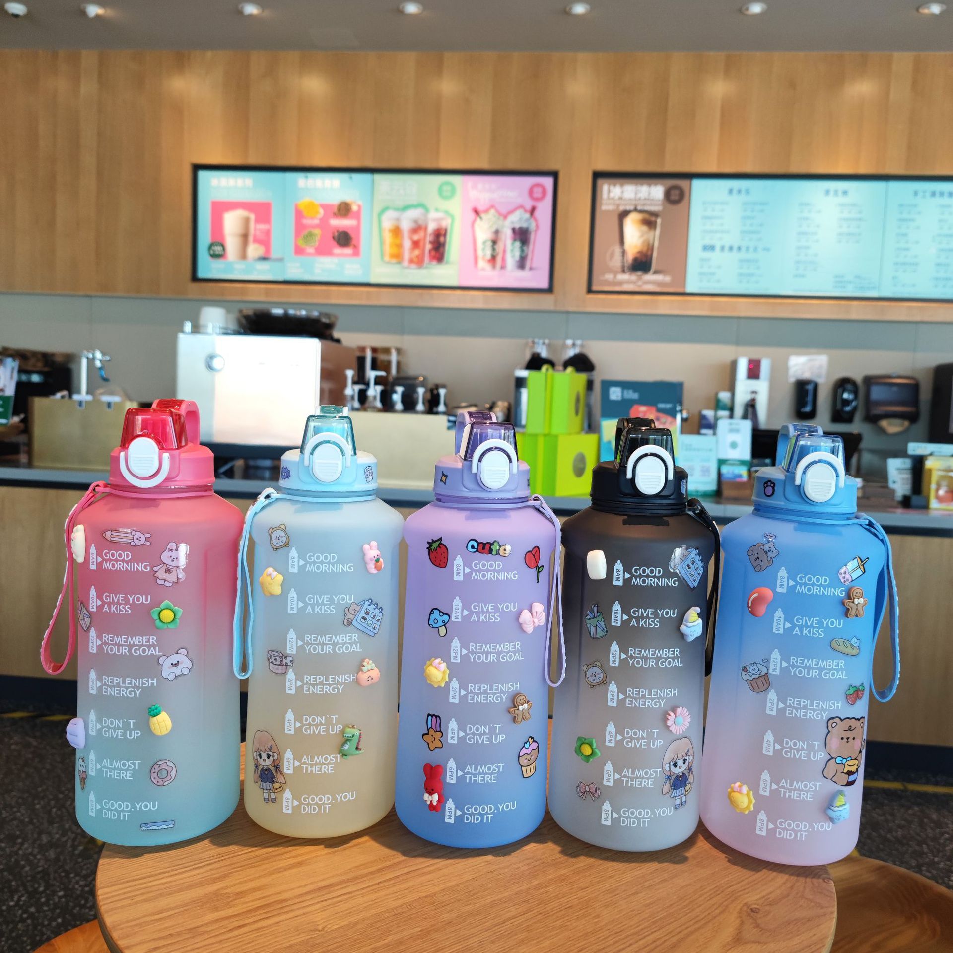 2l大容量プラスチックストローカップグラデーション色バウンスカバー高颜値スポーツ水筒ロープ付き携帯宇宙カップ