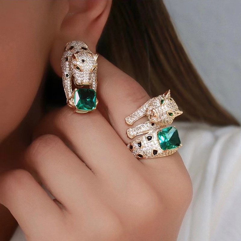 おしゃれな大げさな黒の斑点の豹の緑のドリルのイヤリングの欧米の復古の小さい大衆の覇気の立体の豹の頭の指輪の口の指