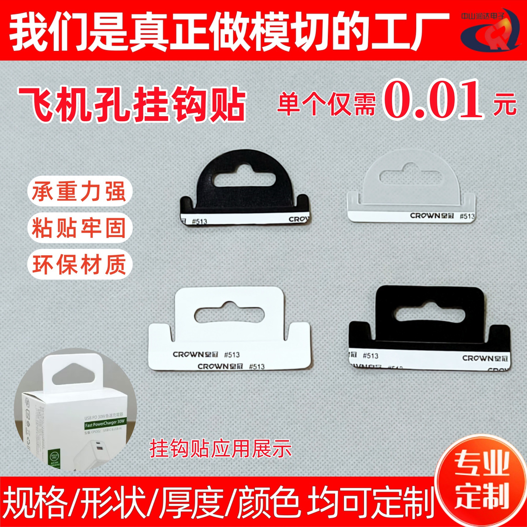 フック付きプラスチック製飛行機穴PET/PVC粘着包装箱用三角穴ステッカー、電子機器包装専用