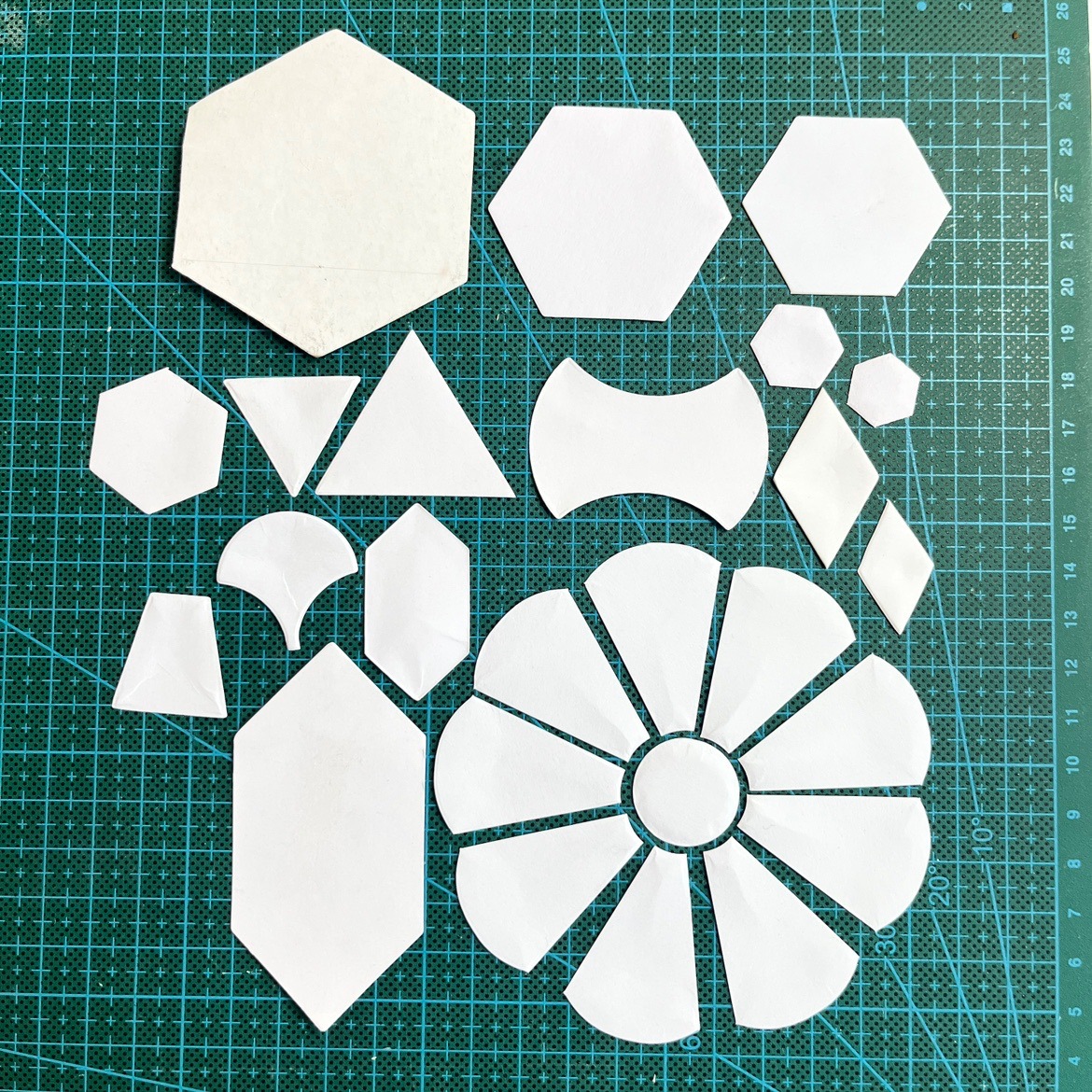 手作りの布の紙片の六角の辺型のはしご型の扇形のダイヤモンドの丸い祖母の花園は紙型の鋳型の材料を詰めます。