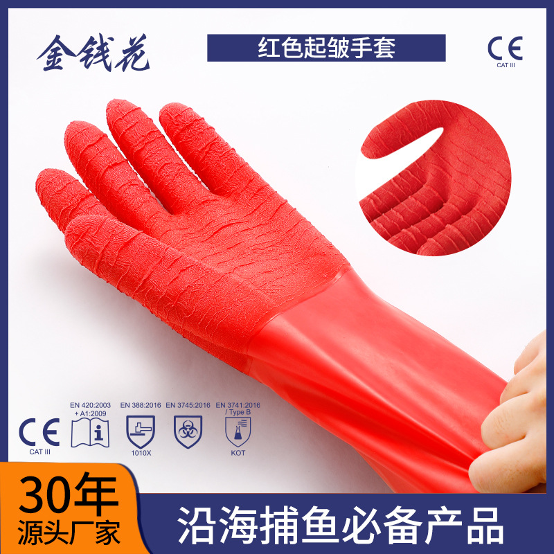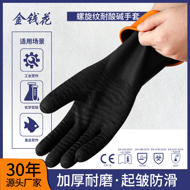 35cmスパイラル柄滑り止めラテックス手袋、耐酸アルカリ、防腐、耐薬品、厚手ゴム製しわ手袋(卸売)