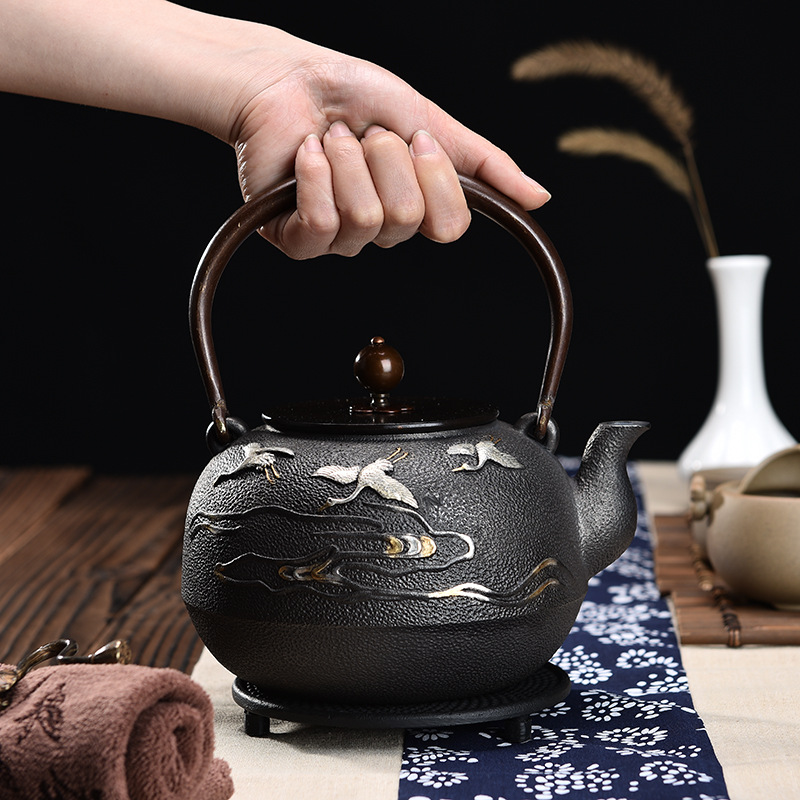 1400ml神鶴群飛提梁壺日本鋳鉄無コーティング手煮水養生鋳鉄壺茶器