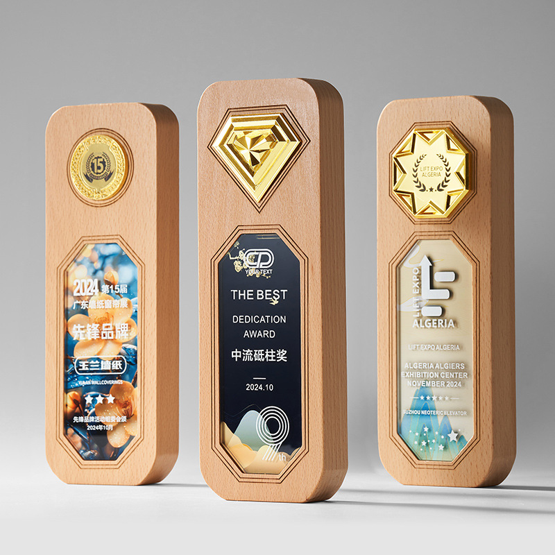 新型トロフィーメダル高級大気会社優秀社員先生創意栄誉記念実木水晶トロフィー