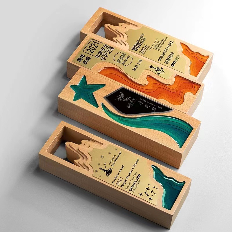 新型木製トロフィーけやき木実木トロフィー五角星アクリルトロフィー個性栄誉トロフィー無料彫刻
