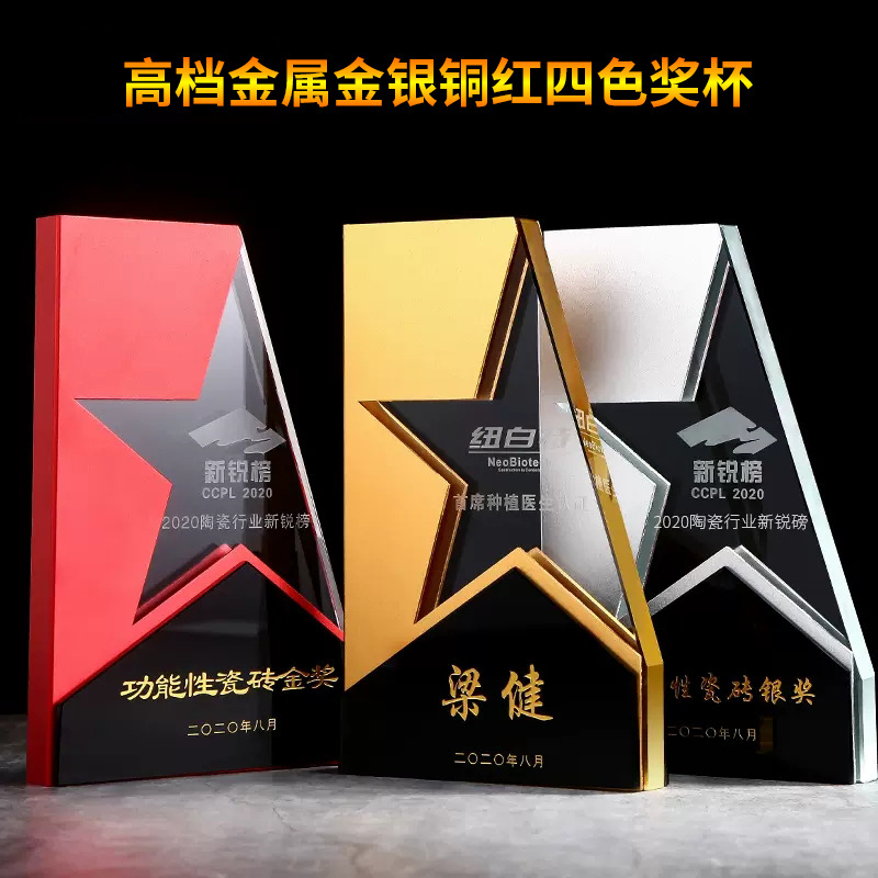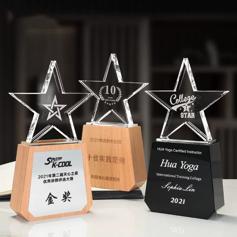 高級金属水晶トロフィー制作創意金銀銅五芒星公司優秀社員年度記念トロフィー