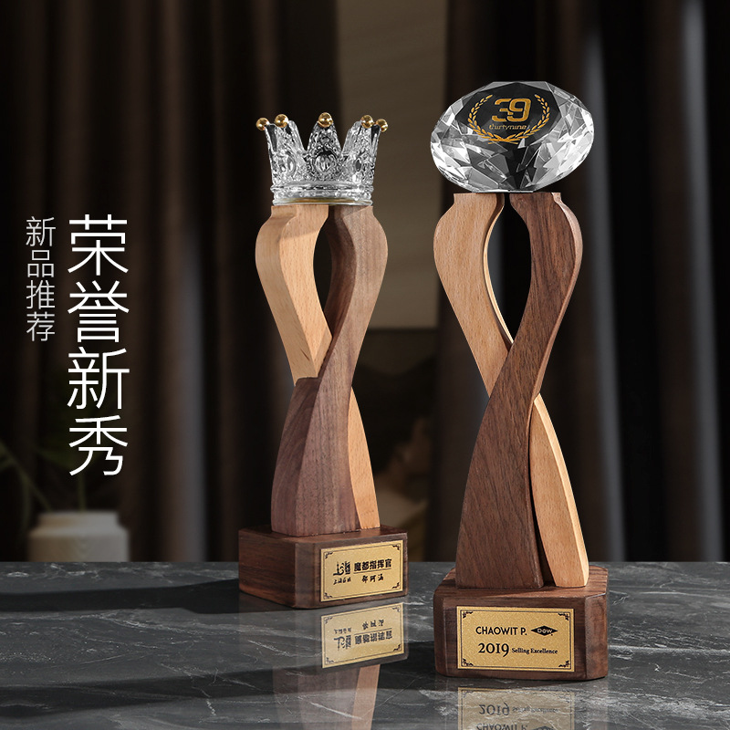 トロフィーの王冠のダイヤモンドの木造の実木の従業員の授賞活動の木のトロフィーは字の優秀な四半期の販売の優勝を彫ります。