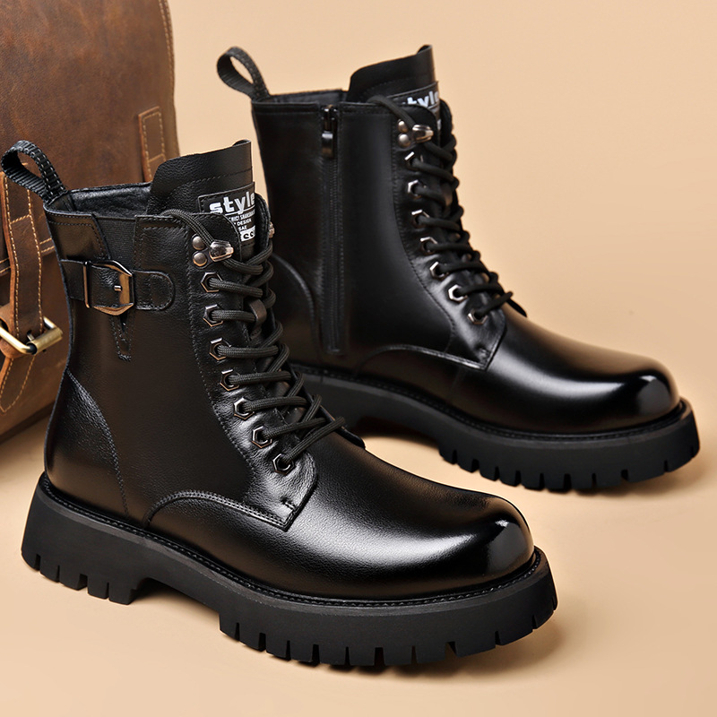 本革マーティンブーツ男性ベルベット保温ショートブーツinsトレンド厚い底騎士ブーツ英倫風通気ブーツ