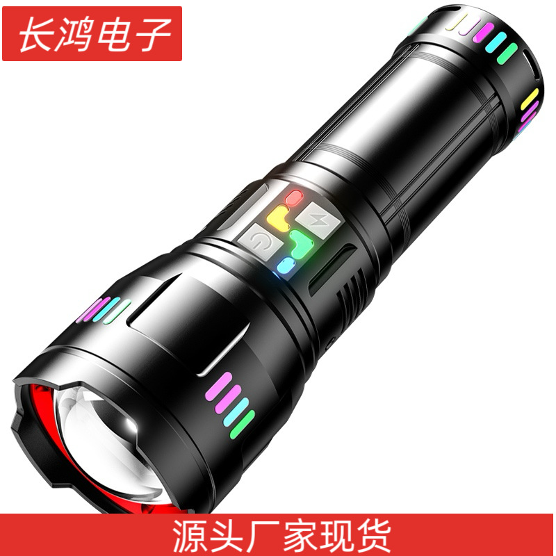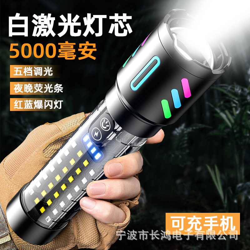 新型白レーザー伸縮ズーム強光懐中電灯家庭用屋外遠射赤青警告側灯led懐中電灯