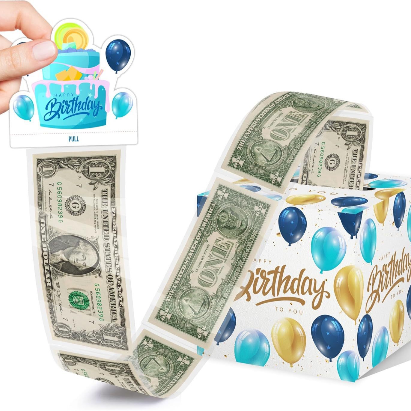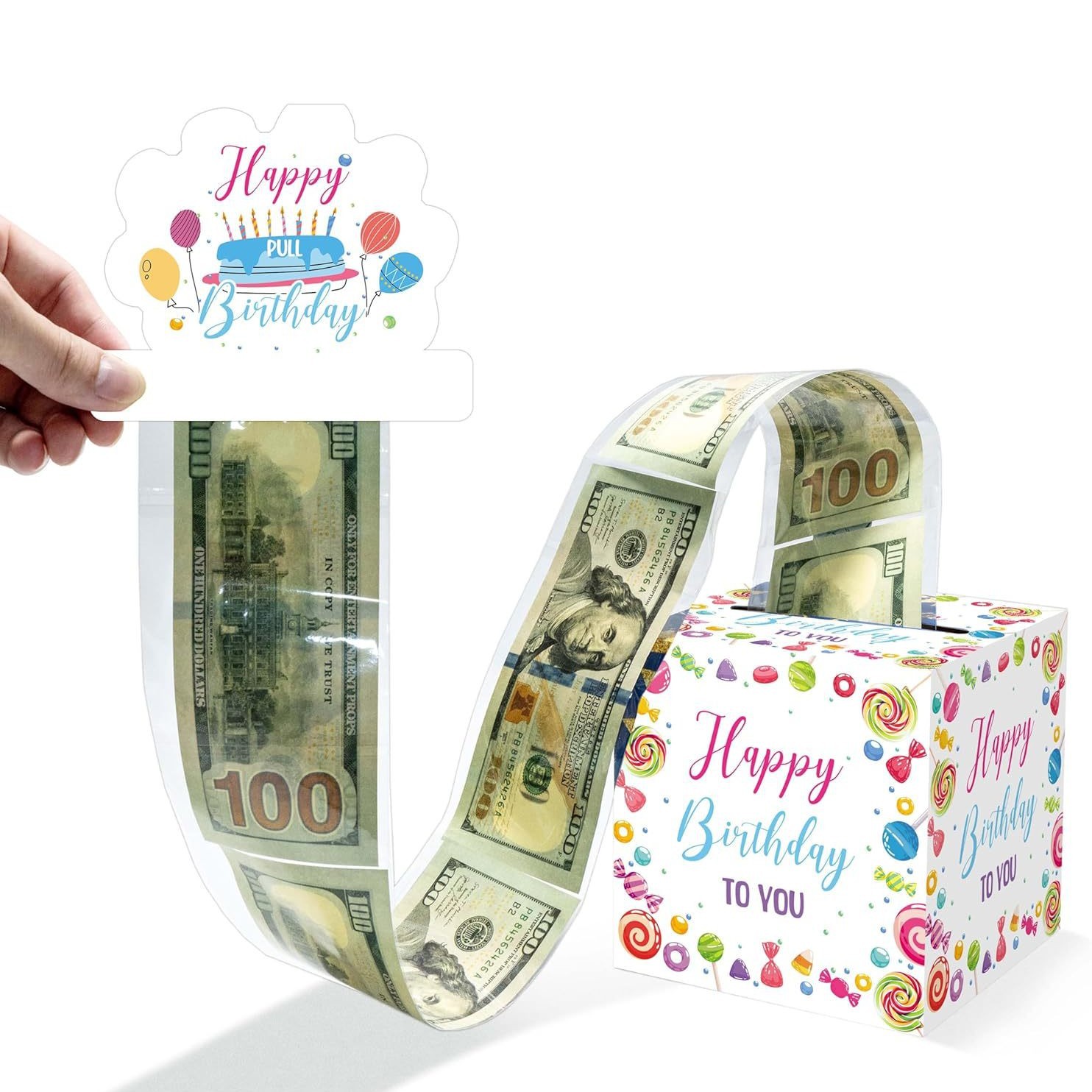 現金の誕生日のお金のサプライズの箱、誕生日のお金の箱、キャンディーの甘いお祝いの誕生日のお金の引き出しの箱はカードを持っています。