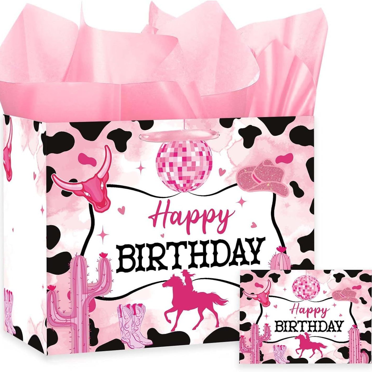 ピンクの女性カウボーイ誕生日ギフトバッグセットティッシュ付き超誕生日バッグ女の子カウボーイパーティー装飾西