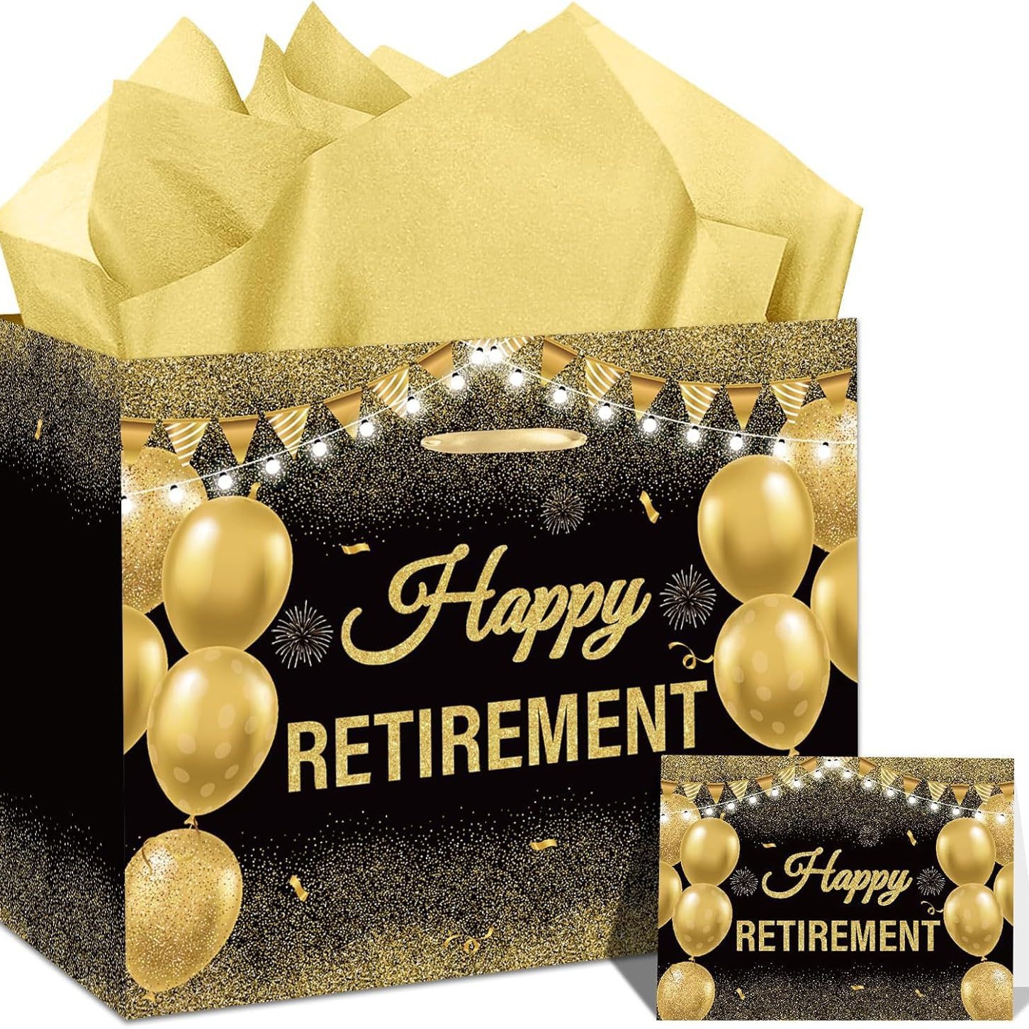 退職ギフトバッグティッシュセット大サイズ黒色金色楽しい退職包装ギフトバッグとグリーティングカード男女