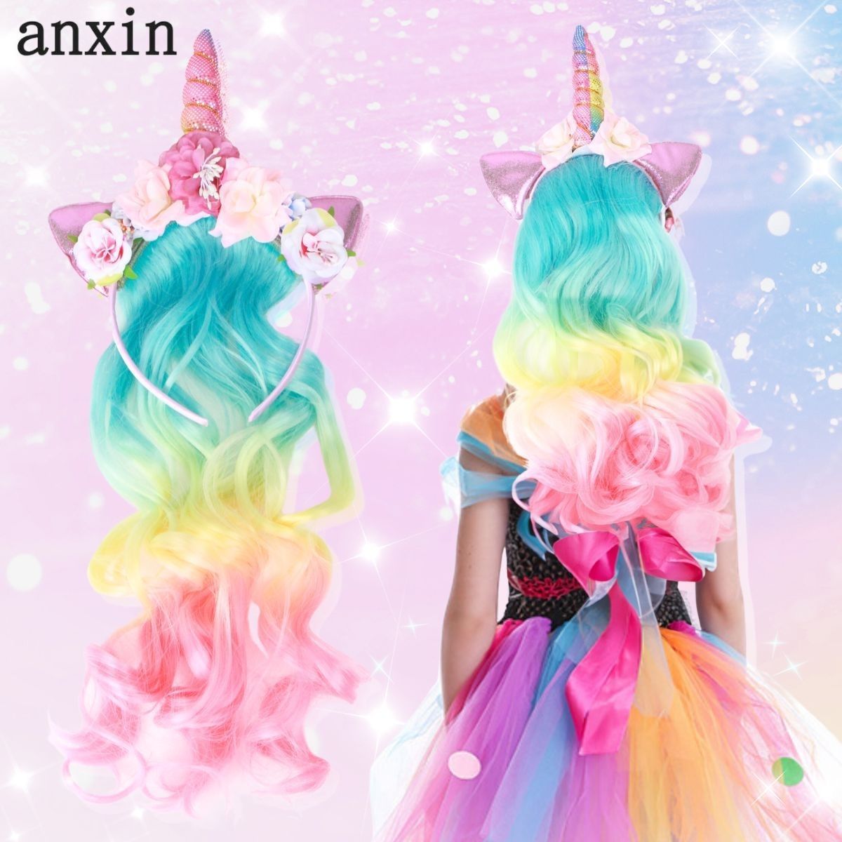 秋の新子供かつらカラフルなヘアアクセサリーストレートヘアポニー子供ヘアピンユニコーンカーリー女の子ヘアアクセサリー