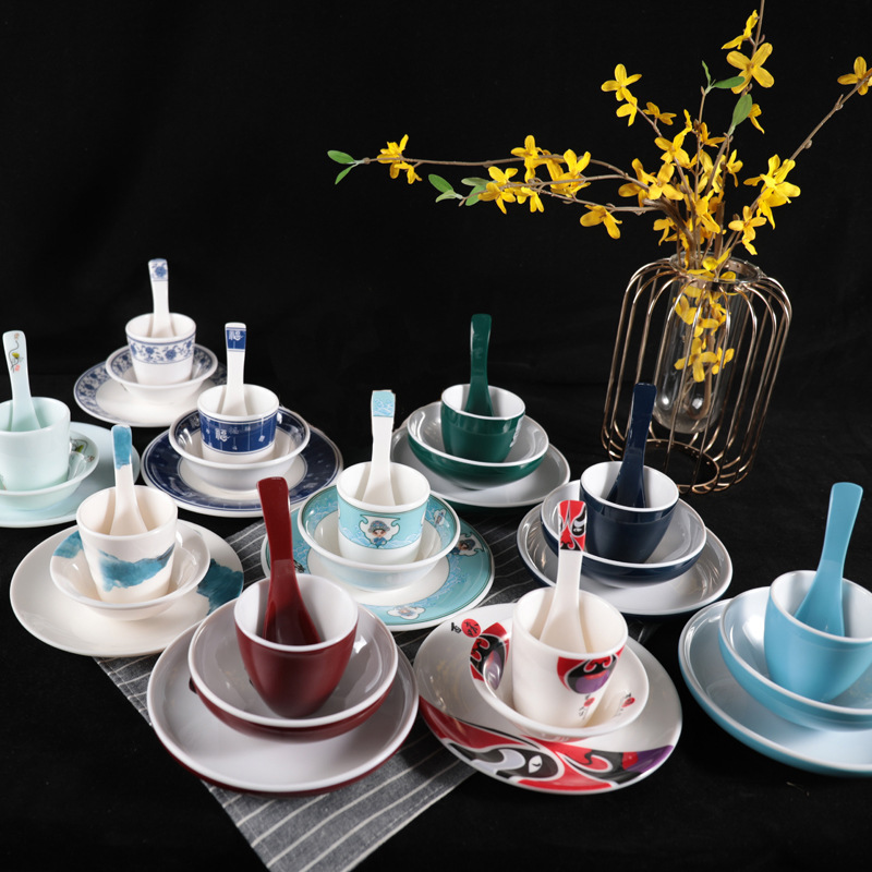 中国風の顔譜のメラミンの鍋の店の4つのセットは台の食器のセットの高級な中国式ホテルのご飯の碗のスプーンを並べます。
