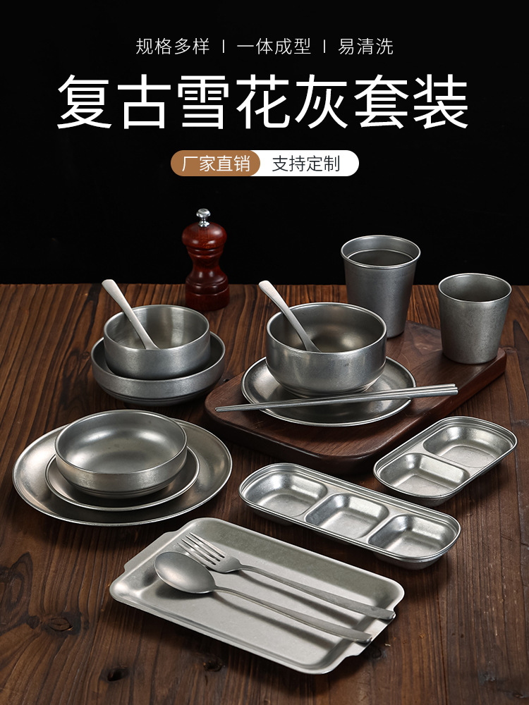 レトロなステンレス鋼の食器セット、古い食器、水カップ、箸、スプーン、長方形プレート、バーベキューショップのディッシュプレート