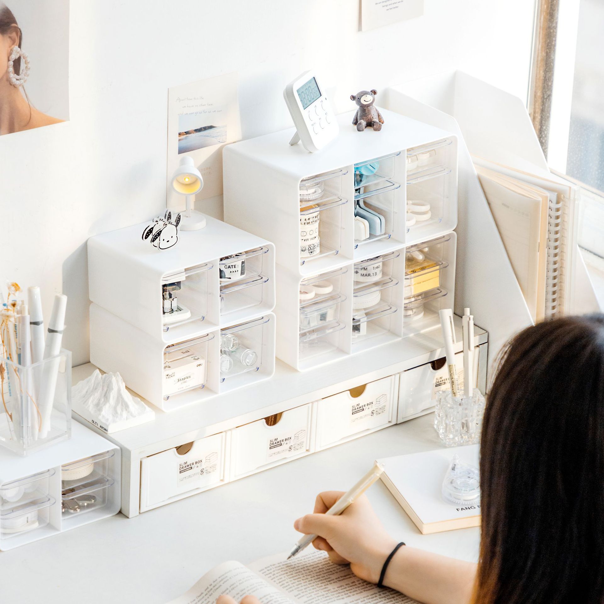 引き出し式透明ホワイトデスクトップ文房具収納ボックス学生風プラスチック化粧品口紅収納ボックス多機能