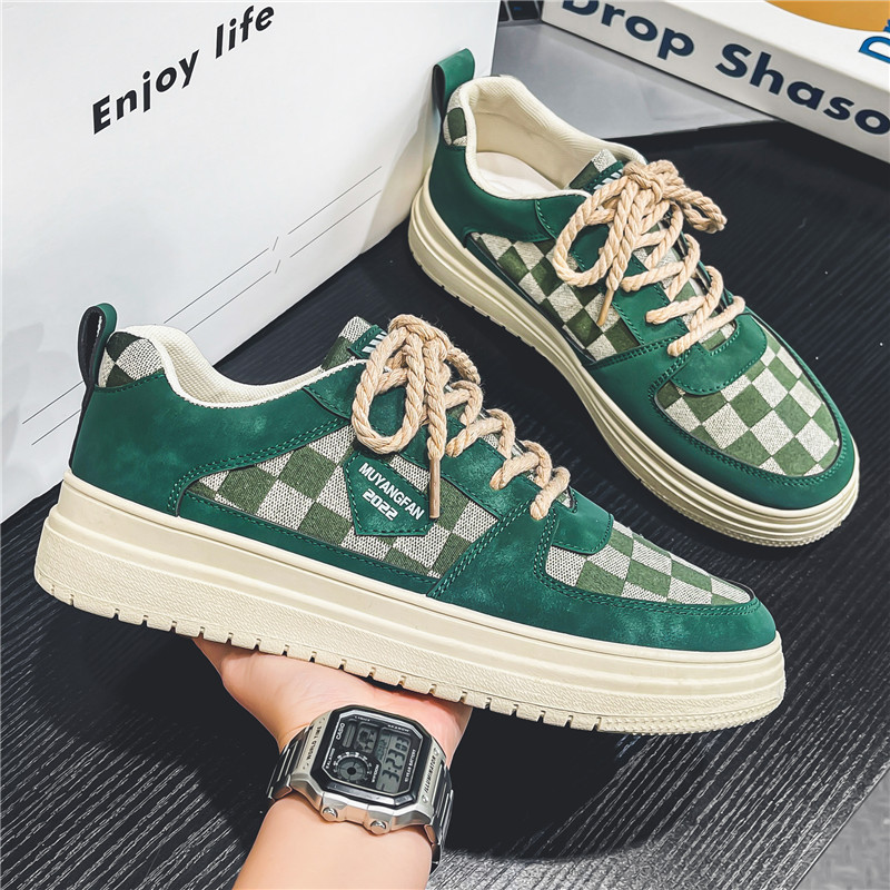 春夏国潮風四季モデルの小衆厚い底ins皮面板靴港風格子風通気靴松餅靴男