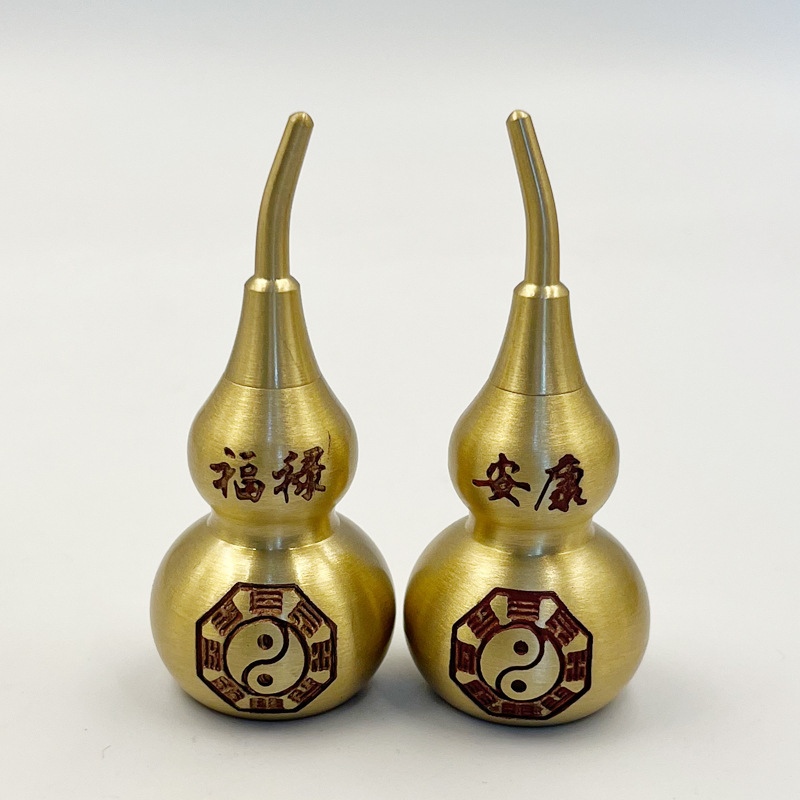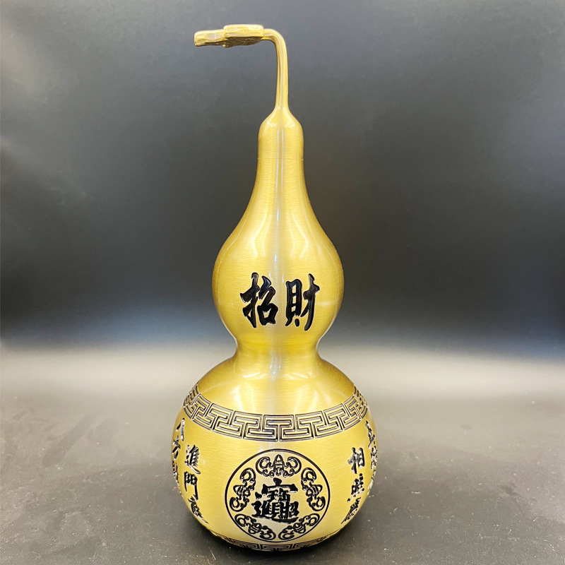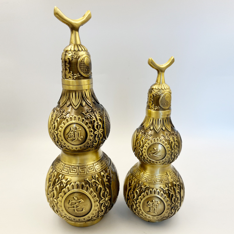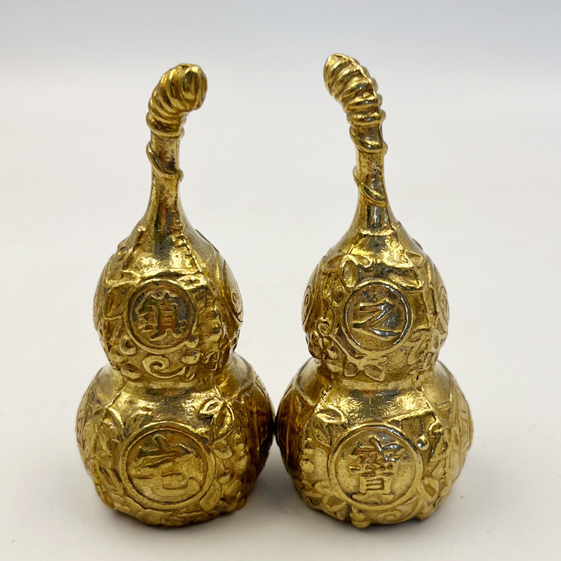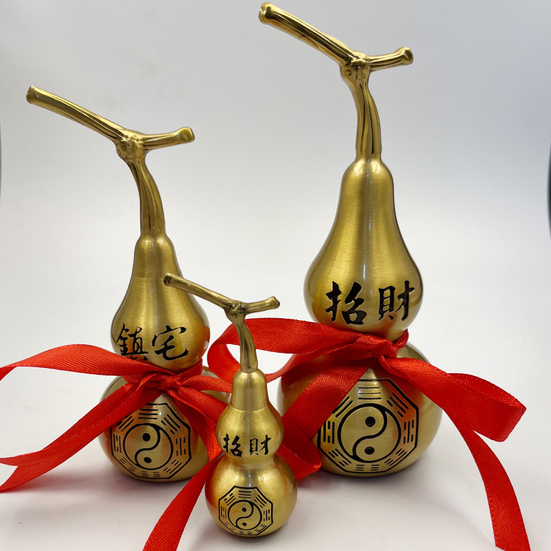 真鍮のヒョウタンが開いています。真鍮の中空の小さいサイズの一体型のストラップの八卦ヒョウタンが家庭用のプレゼントを飾っています。