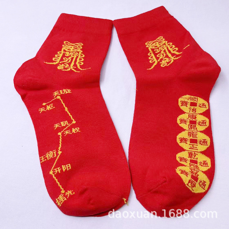 七星鎮の図案五帝のお金の図案の赤い靴下の鴻運の靴下の弾力性のメリヤスの人気の足の裏を踏みます。