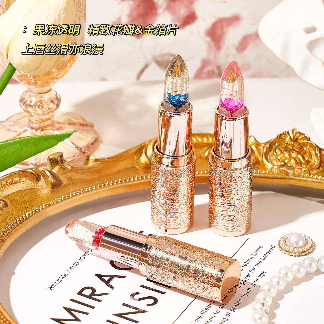 花びら生花ゼリー変色口紅金箔透明温変リップクリームはカップをつけずに色を落とさずに保湿卸売りをする