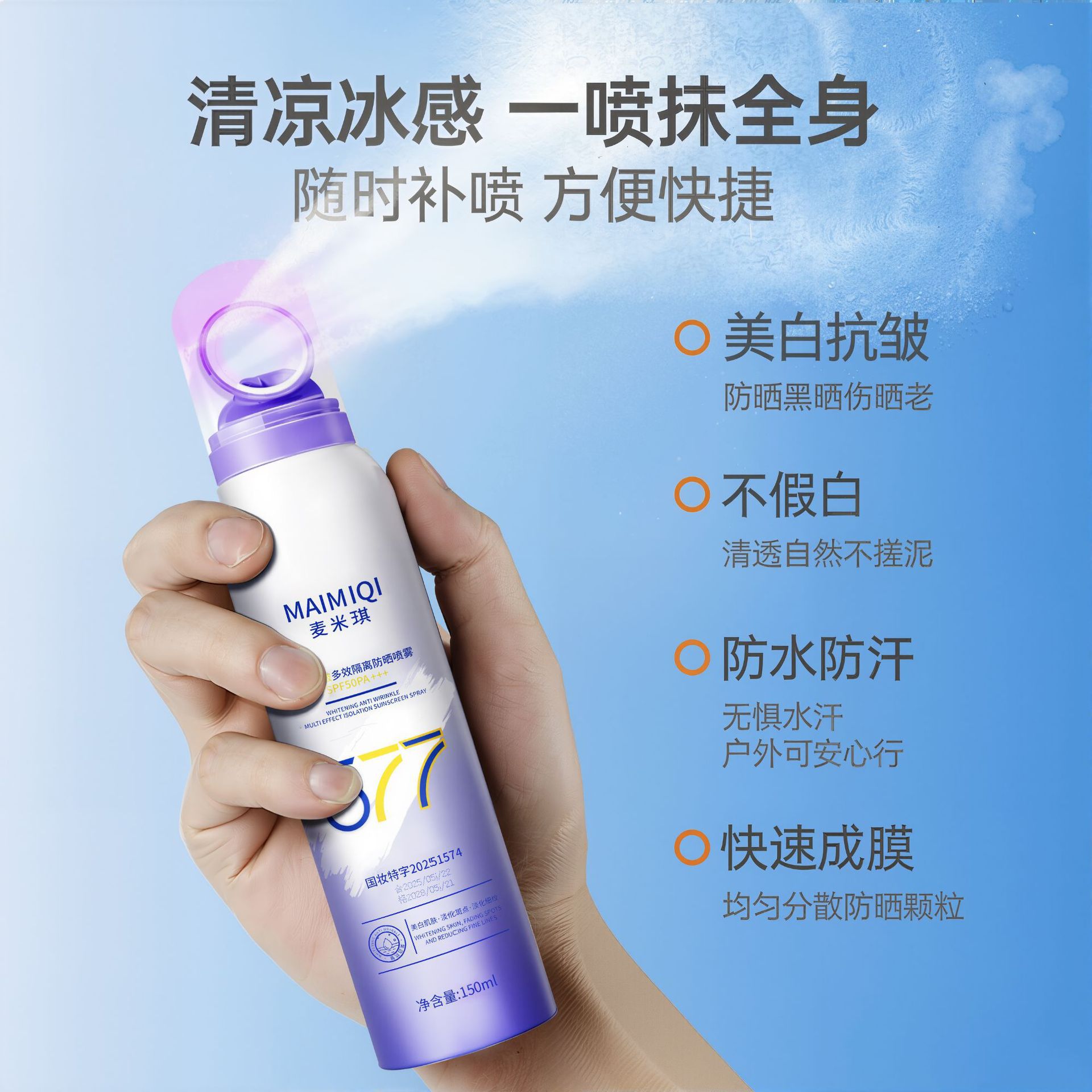 麦米琪美白抗シワ日焼け止めスプレーSPF50高倍隔離紫外線を防ぐ爽やかな油のない軍事訓練日焼け止め