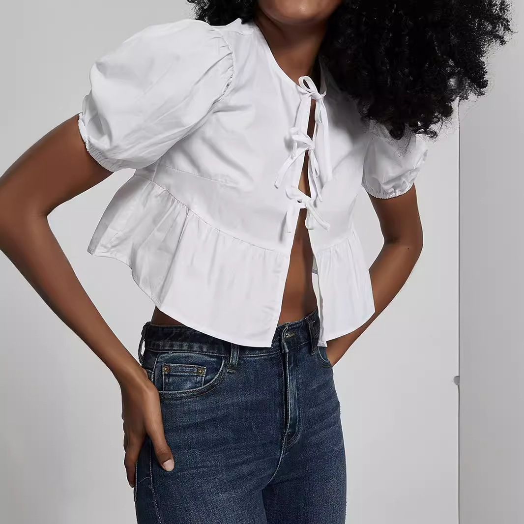クロスボーダーの女性服の卸売り欧米風の甘い蝶結びのシャツの短い丸首の純色の上着の夏服