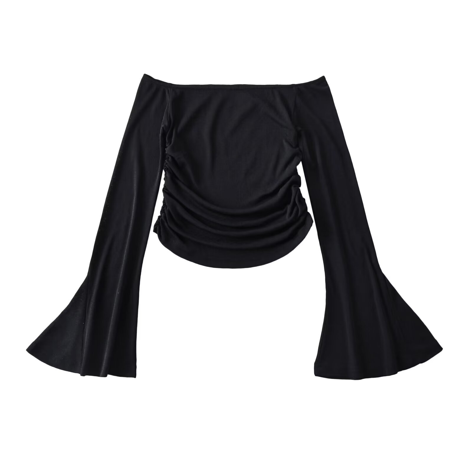 クロスボーダー婦人服卸売ホットガールセクシースリムフィットメッシュワンラインカラー長袖Tシャツストレッチショートベルスリーブトップ