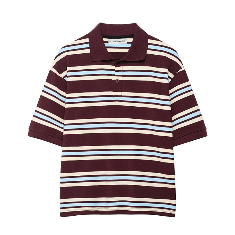 クロスボーダー婦人服卸売ヨーロッパとアメリカンスタイルのレトロなコントラストストライプポロシャツ襟ルーズ半袖Tブラッド