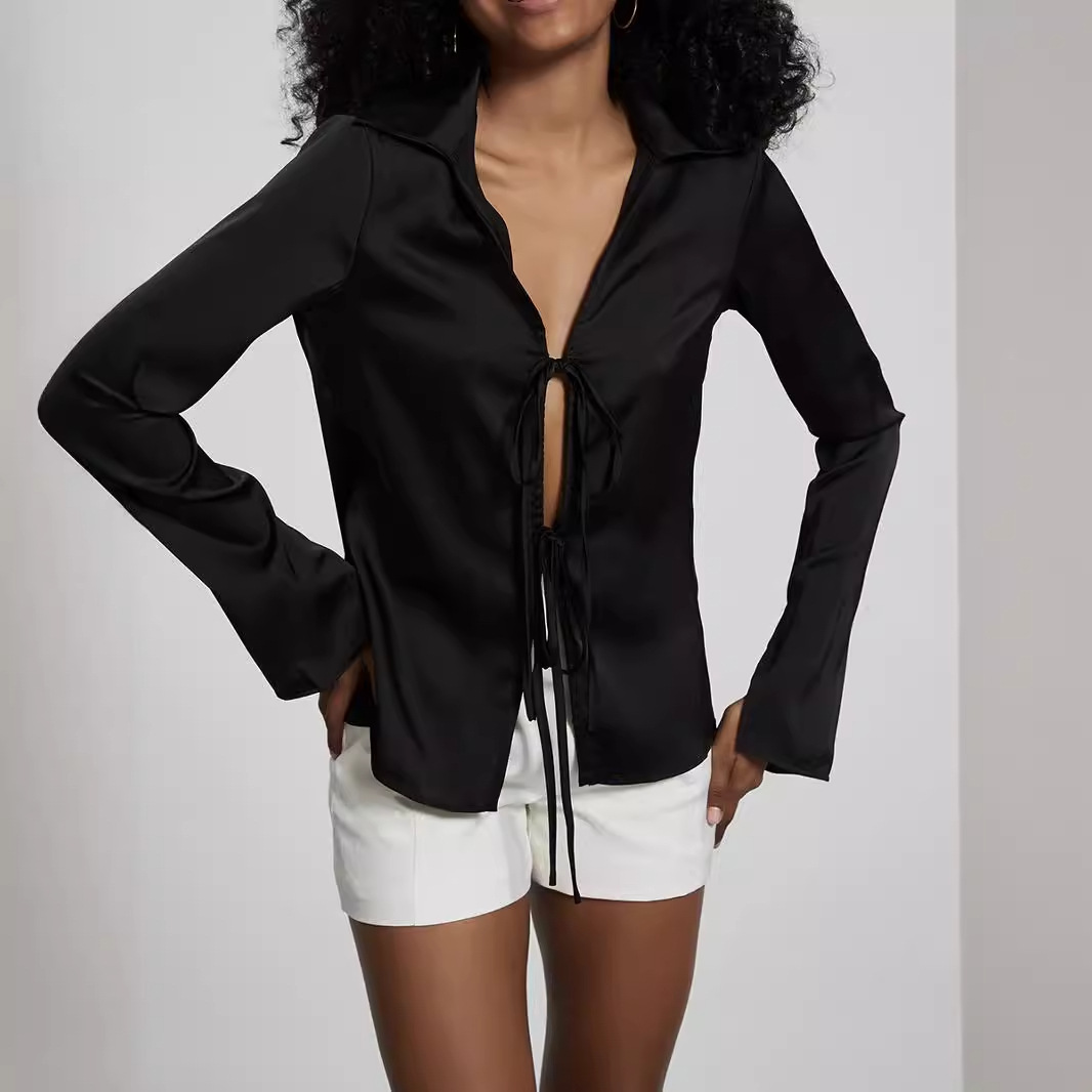 クロスボーダー婦人服卸売ヨーロッパとアメリカンスタイルのサテンテクスチャーシャツ気質多用途レースアップドレープシャツトップ