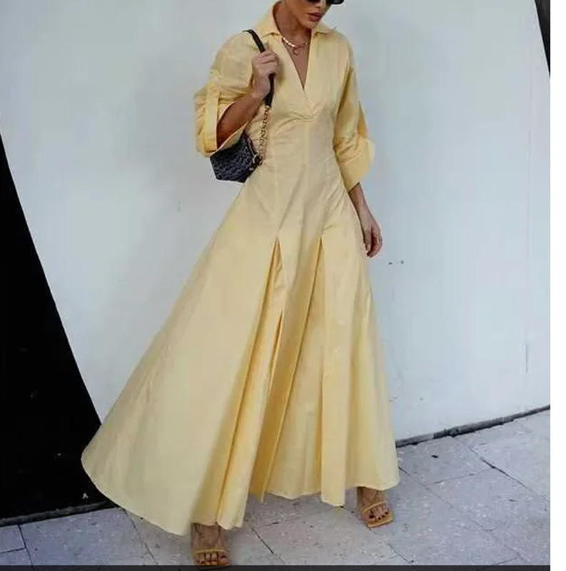 跨境女装批发时尚欧美风休闲翻领衬衫长款女收腰大摆连衣裙