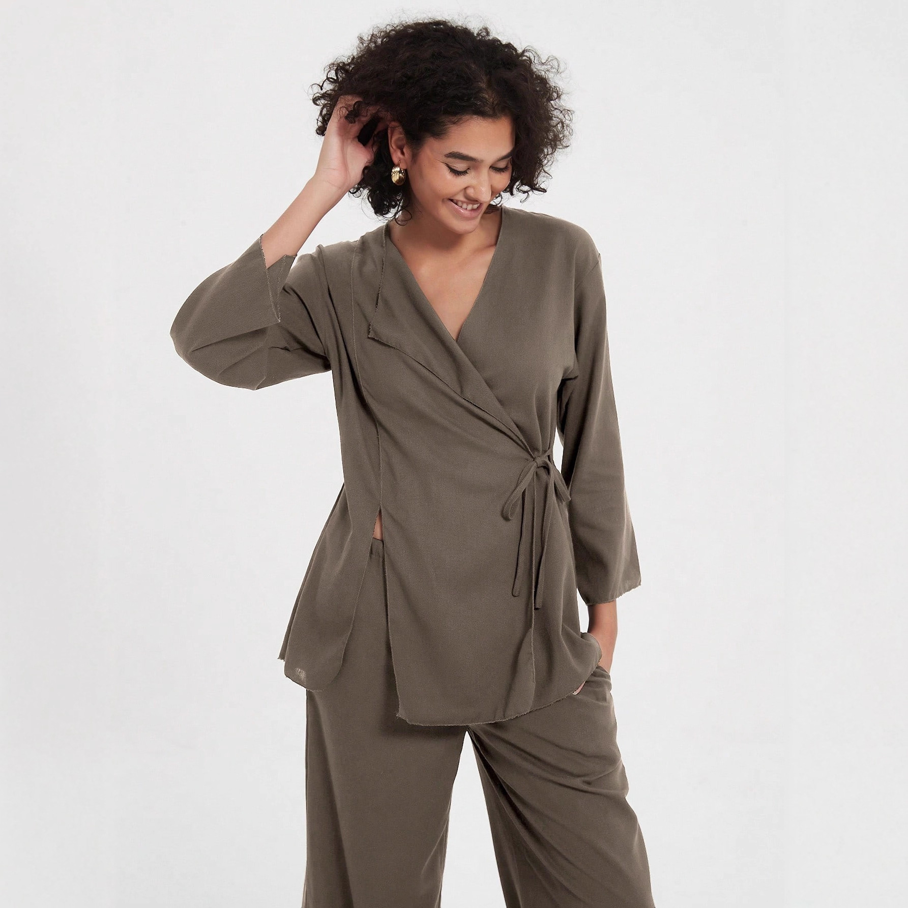 クロスボーダー婦人服卸売ヨーロッパとアメリカンスタイルのVネックレースアップ着物スタイルのルーズ長袖トップとハイウエストワイドレッグパンツスーツ