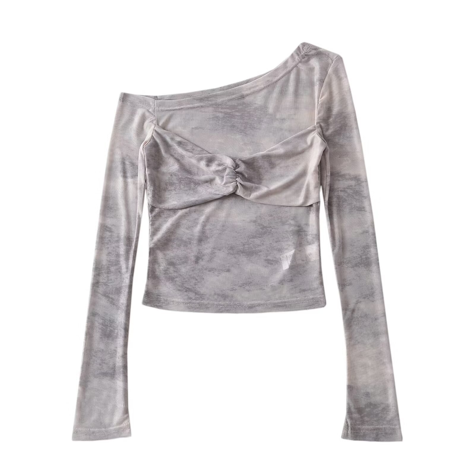 クロスボーダー婦人服卸売純粋な欲望ホットガールワンラインカラーオフショルダータイダイ長袖メッシュプリーツスリムショートTシャツ