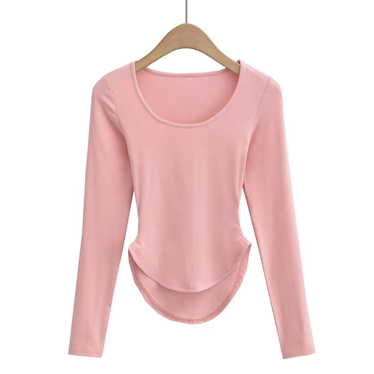 クロスボーダー婦人服卸売長袖ピンクトップススリムTシャツスイートホットガール新しいスリムアリウエストボトリングシャツ