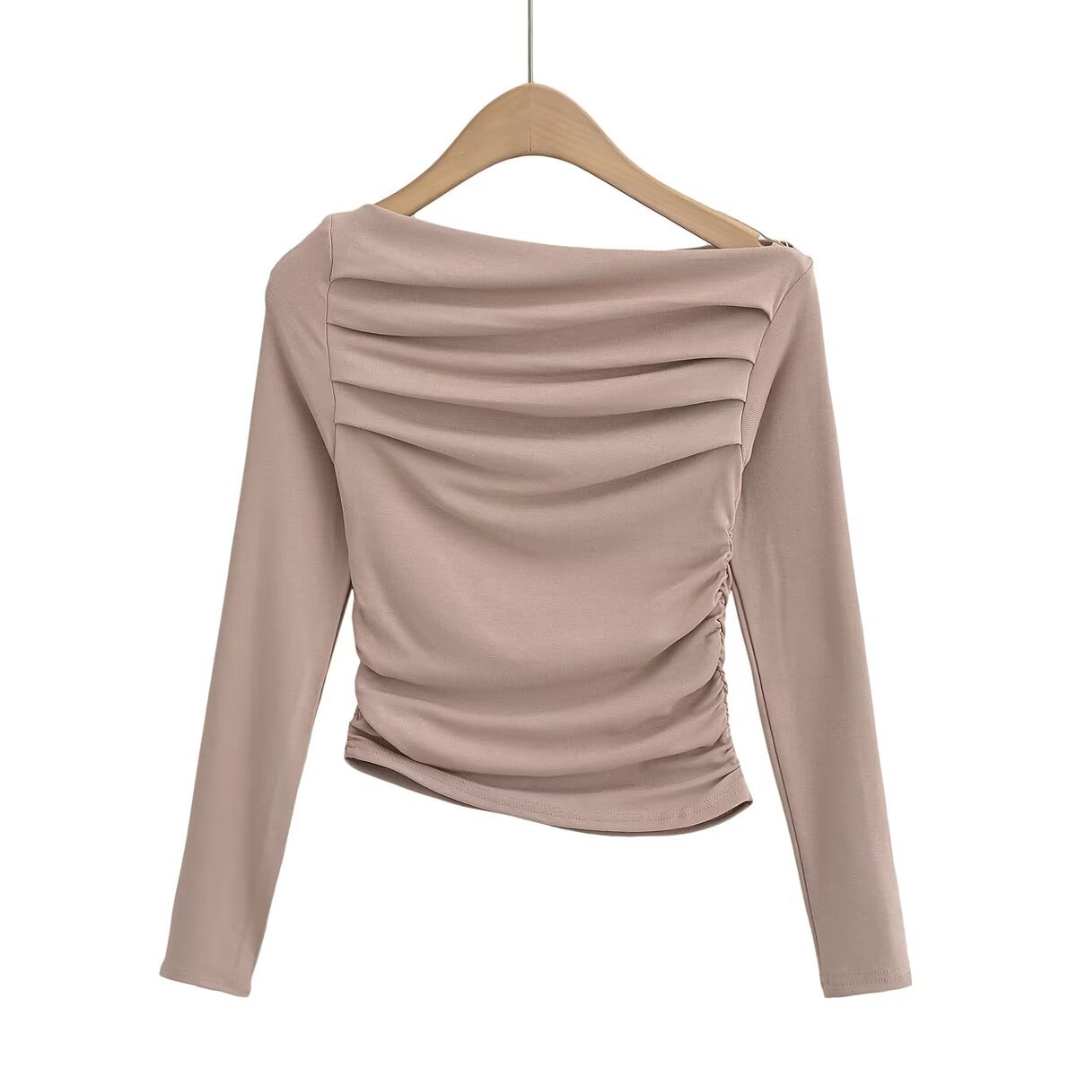 クロスボーダー婦人服卸売秋甘辛インスラントショルダーボトリングシャツスリムプリーツ長袖ショートTシャツ