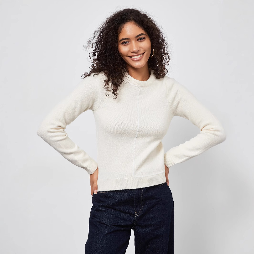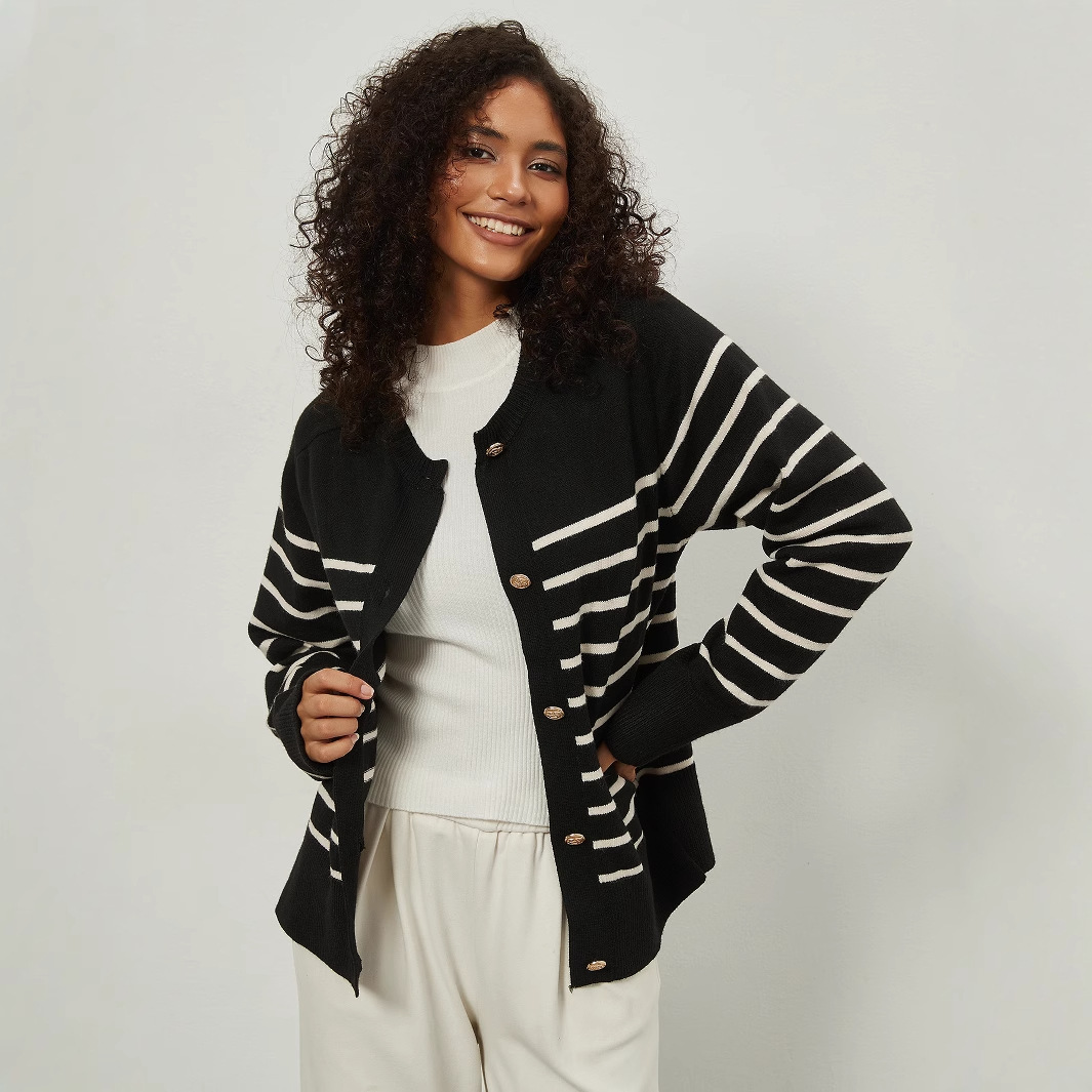 アマゾンクロスボーダー女装卸売り欧米風ファッションゆるい丸首金ボタン縞色長袖ニット
