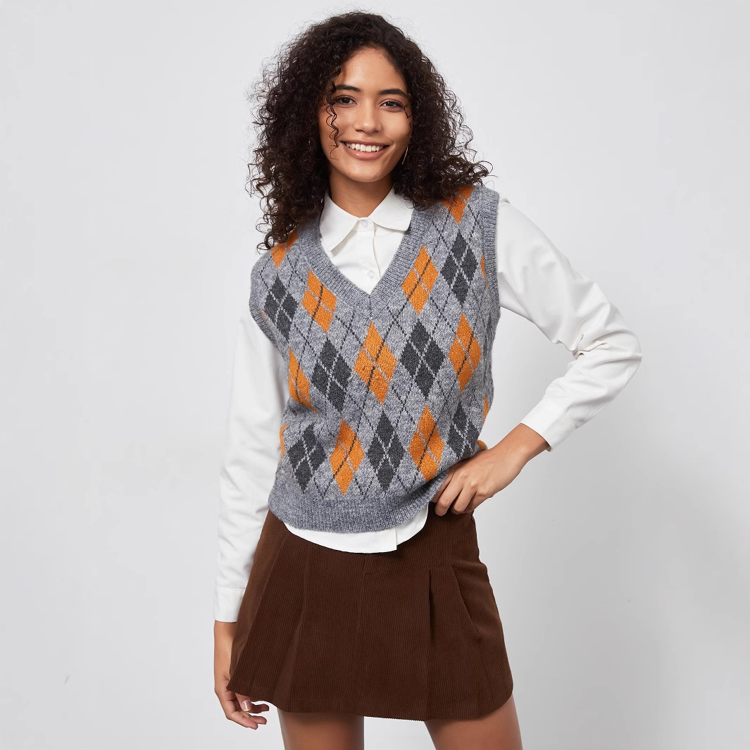国境を越えた電気商女装卸売り欧米学院風菱形格ニットベスト秋の新型格子馬甲上着