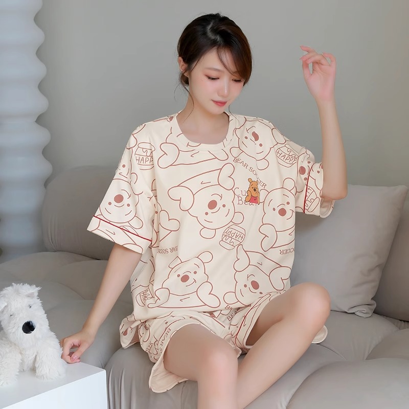 漫画の熊のパジャマの女性は綿の新型の夏の丸首の半袖の半ズボンの学生の寮の外で部屋の服のスーツを着ます。